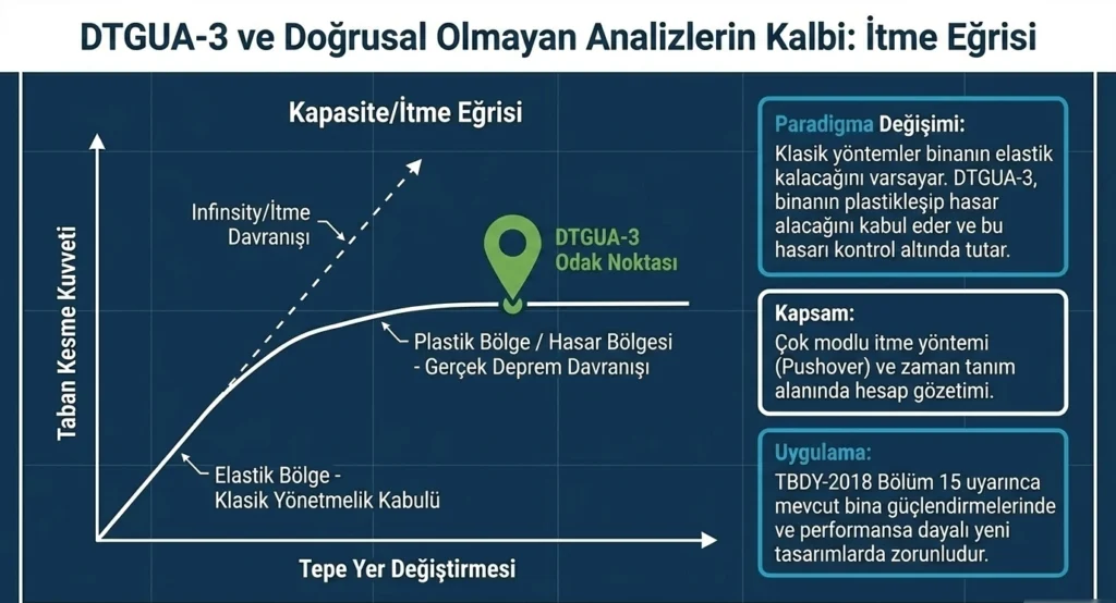 Mevcut bir binanın depreme karşı dayanımını değerlendirmek ya da yeni yapılacak bir binayı performans tabanlı yöntemlerle tasarlamak isteyen her mühendislik süreci, eninde sonunda aynı kavramla karşılaşır: doğrusal olmayan analiz. Ve bu analizlerin bağımsız mühendislik kontrolünden sorumlu olan uzmanlık alanı DTGUA-3’tür.