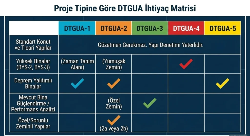 Güçlendirme projesi için mutlaka DTGUA-3 gözetmeni gerekli midir? TBDY-2018 Bölüm 15 kapsamında yapılan performans tabanlı güçlendirme projelerinde evet, zorunludur. Gözetmen hizmeti alınmadan hazırlanan projenin yapı ruhsatı aşamasında sorun çıkarması yüksek ihtimaldir.