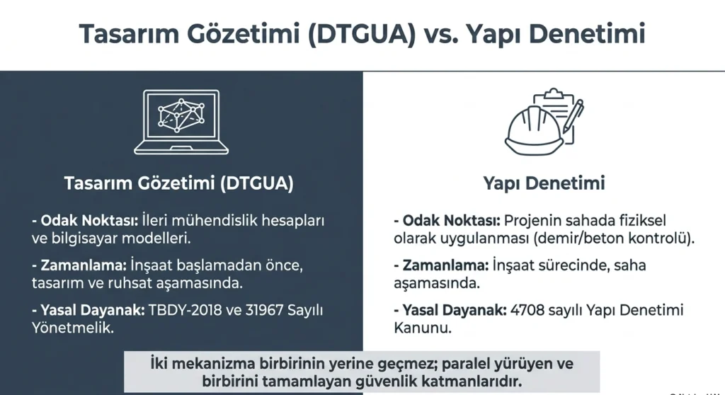 Tasarım gözetmeni uzmanı ile yapı denetçisi aynı şey midir? Hayır. Yapı denetçisi, 4708 sayılı Yapı Denetimi Kanunu kapsamında inşaat sürecinde sahada denetim yapar. Tasarım gözetmeni ise projenin tasarım aşamasında, özel uzmanlık gerektiren deprem hesapları için bağımsız mühendislik kontrolü sunar. Yaptıkları işler birbirini tamamlayıcıdır, ancak birbirinin yerine geçmez.
