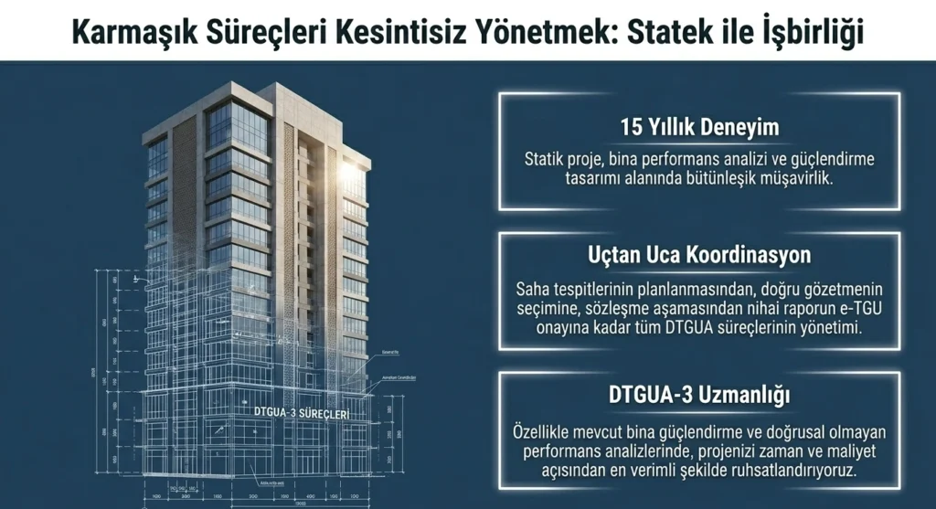 Özellikle DTGUA-3 kapsamındaki mevcut bina performans değerlendirmesi ve güçlendirme projeleri alanında sahip olduğumuz deneyim, gözetmenlik sürecini hızlı ve eksiksiz yürütmenize imkân sağlıyor. Süreçle ilgili detaylı bilgi almak için iletişim sayfamızdan bize ulaşabilirsiniz.