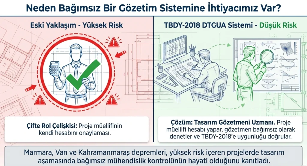 Tasarım gözetmeninin ön plana çıkan özelliği, bağımsız bir mühendislik kontrolü sunmasıdır. Yani proje müellifi ile yapı sahibi arasında ayrı bir uzman gözle, projedeki hesap ve tasarım kararlarını TBDY-2018’e uygunluk açısından inceler, onaylar veya düzeltme talep eder.